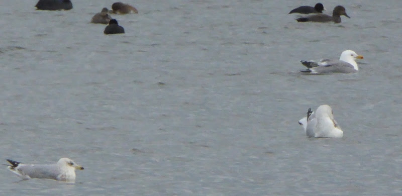 It really stood out amongst the gull flock, its white head almost gleaming and with grey upperwings coloured between the paler herring gulls and darker lesser black backed gulls nearby. Bill chunkier and very bright yellow with a bright red spot compared to gulls nearby, bright yellow legs seen when it leapt up off the water as it bathed and limited white in its wing tips when it eventually flew off - cue some more crappy photos!